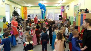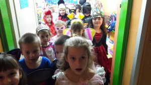 Dzieci ze wszystkich oddziałów ,,zaliczyły” bal karnawałowy. Rodzice przebrali swoje pociechy w stroje ulubionych bohaterów, przeważały księżniczki, policjanci i strażacy. Zabawa była prowadzona przez wodzireja. Nauczycielki i dzieci wspólnie bawili się w radosnej i nieskrępowanej  atmosferze. Niektóre dzieci po jakimś czasie tanecznych ,,szaleństw” były zmęczone – co widać na niektórych zdjęciach. Humory wszystkim jednak dopisywały. Soki i batoniki wzmocniły je. Odczucia dzieci w rozmowach z rodzicami: wspaniale, fajnie, świetnie. Załączamy kilka zdjęć, reszta do obejrzenia na fb.