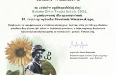 Z dumą informujemy, że nasze przedszkole otrzymało dyplom za udział w ogólnopolskiej kampanii „BohaterON – włącz historię!”, poświęconej kobietom walczącym i niosącym pomoc podczas Powstania Warszawskiego. 🇵🇱