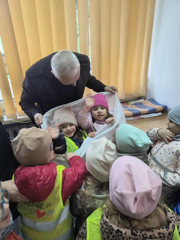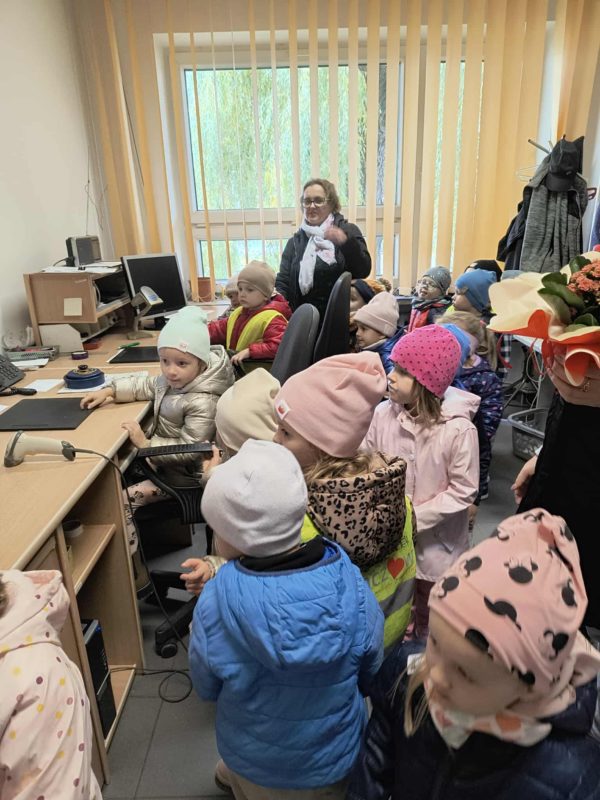 Grupa II „Skrzaty” miała dodatkowo wyjątkową okazję zajrzeć za kulisy pracy urzędu. Pan Naczelnik pokazał dzieciom miejsce pracy listonoszy, rozdzielnię listów, worki i skrzynki, w których przewożone są przesyłki. Opowiedział o codziennej organizacji pracy, a dzieci mogły dla zabawy sprawdzić, jak pojemne są worki pocztowe. Przedszkolaki odbijały także pieczątki i zobaczyły maszynę, która wykonuje to zadanie automatycznie.