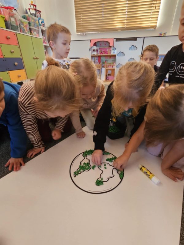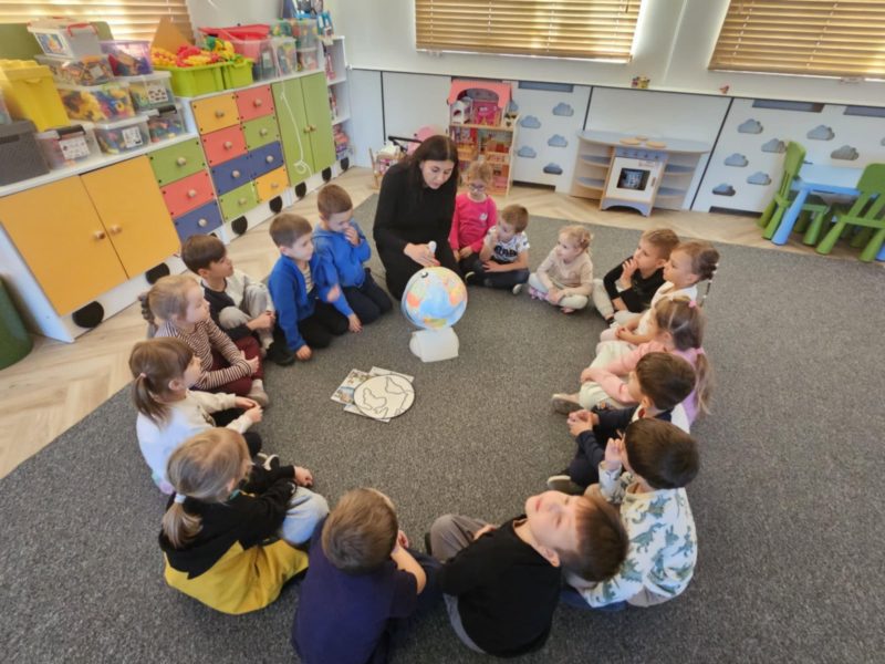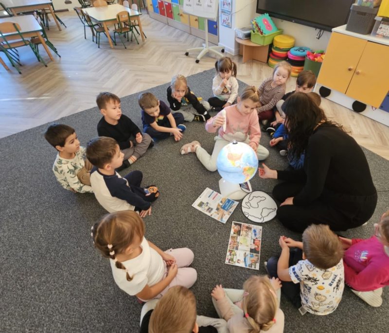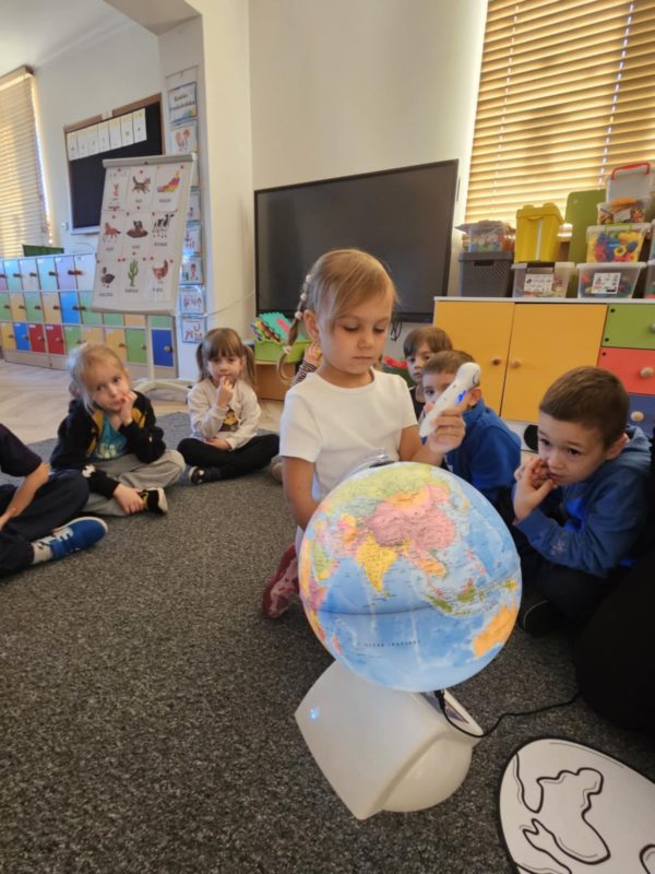 Dzieci korzystały z interaktywnego globusa Albik, wyszukując różne kraje i poznając ciekawostki o ich mieszkańcach, tradycjach i zwyczajach. 🌐✨
