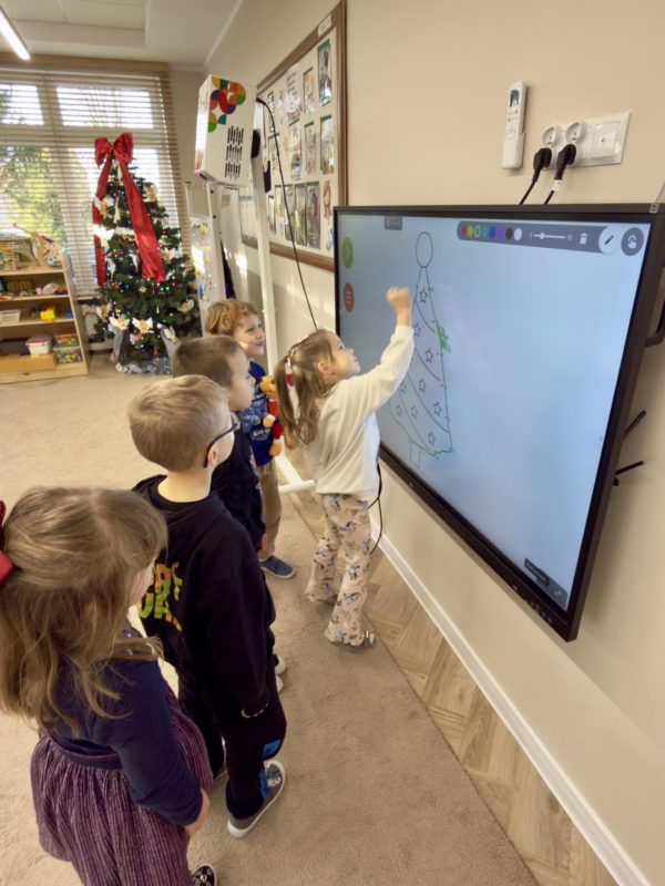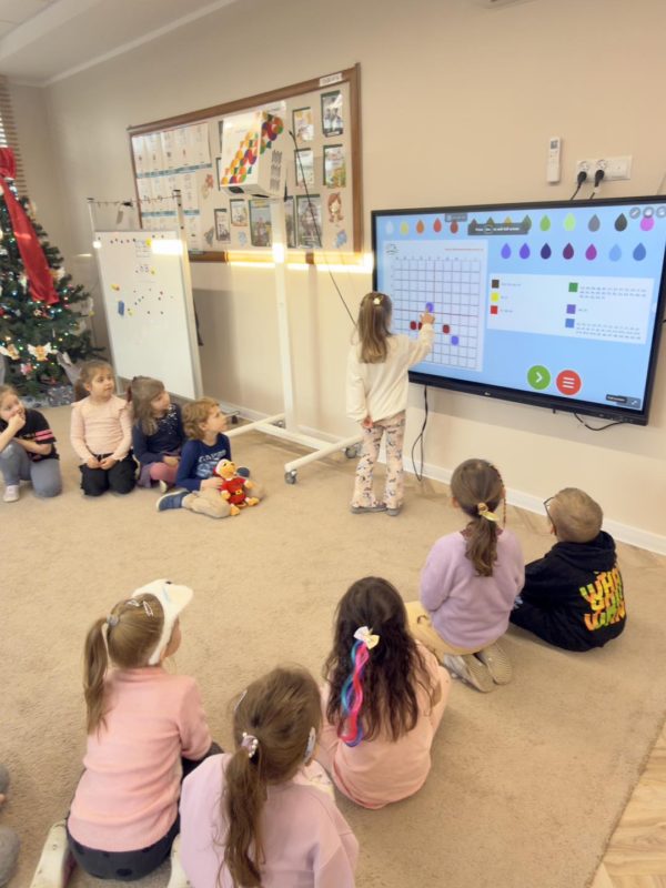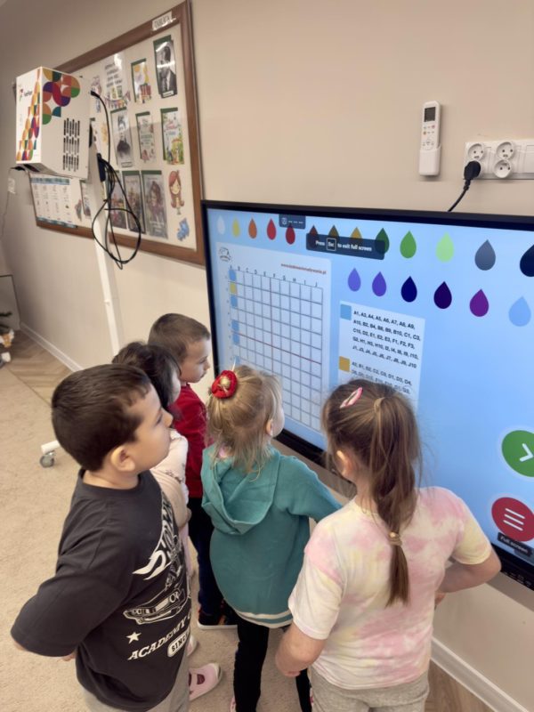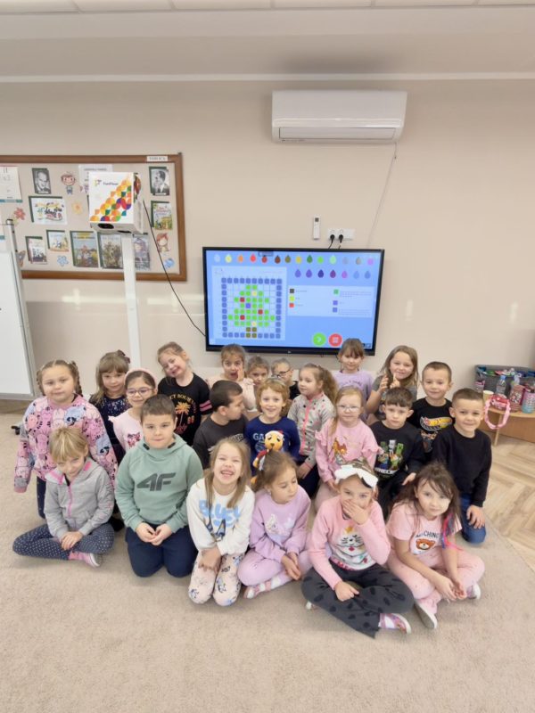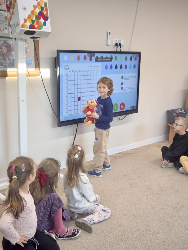 Przedszkolaki z grupy IV „Łowcy Przygód” z dużym zaangażowaniem kontynuują projekt „Kodowanie na dywanie”. Dzięki wsparciu Pani Dyrektor dzieci mogą kodować nie tylko na dywanie, ale również na monitorze interaktywnym z dostępem do Internetu,