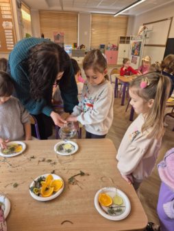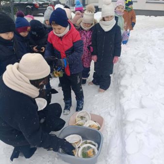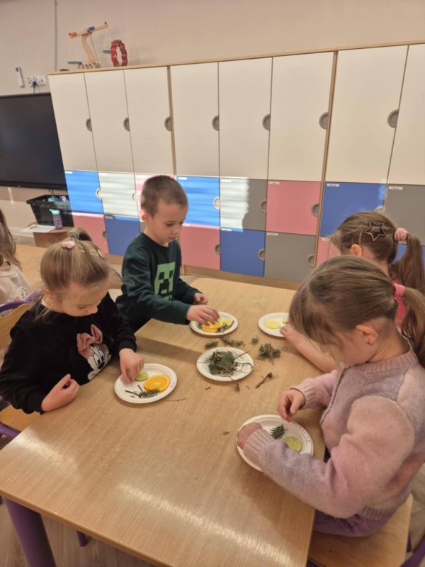 Szczególnym momentem zajęć było działanie „Nuda w lodzie – przyrodnicze dzieła sztuki”. Z owoców, bo patyczków i igliwia dzieci tworzyły kompozycje, które zostały zalane wodą i zamrożone. Powstałe lodowe prace stały się symbolem emocji – pokazując, że nuda, podobnie jak lód, nie jest stanem trwałym, lecz może się zmieniać i prowadzić do czegoś nowego, wartościowego i pięknego ✨
