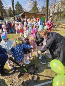 Przy pomocy przedszkolaków pierwsze drzewo zasadził Pan Burmistrz, drugie Pani Dyrektor, a trzecie nauczyciele.