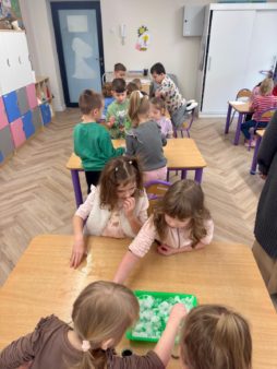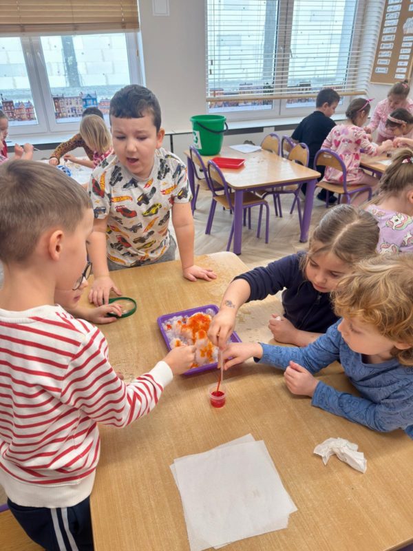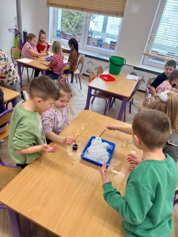 Dzieci poznawały różne stany skupienia wody obserwowały, jak śnieg topnieje w cieple, a woda zamarza, gdy jest zimno. Nie zabrakło także twórczej zabawy 😀 malowaliśmy śnieg i eksperymentowaliśmy, ucząc się przez działanie i doświadczenie. Nauka przez zabawę to najlepsza przygoda! 🎨🧪✨