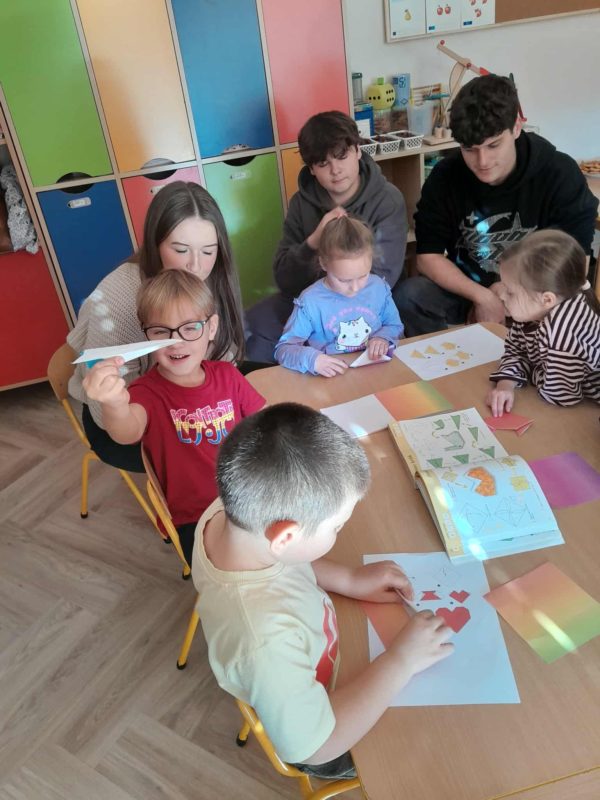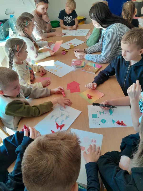 5 listopada grupę V „Chochliki” odwiedzili zaprzyjaźnieni uczniowie z Liceum Ogólnokształcącego w Lubaczowie wraz ze swoim nauczycielem Panią Martą Magołą. Celem wspólnego spotkania było origami czyli sztuka składania papieru.