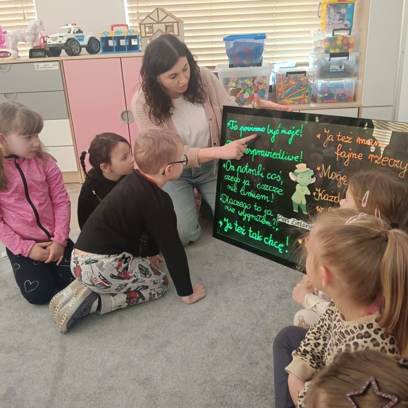 😄 A na koniec dzieci zgodnie stwierdziły, że każdy czasem może… „zazielenić się z zazdrości” jak Pan Zielonek – najważniejsze jednak, by szybko wrócić do dobrych myśli 💚