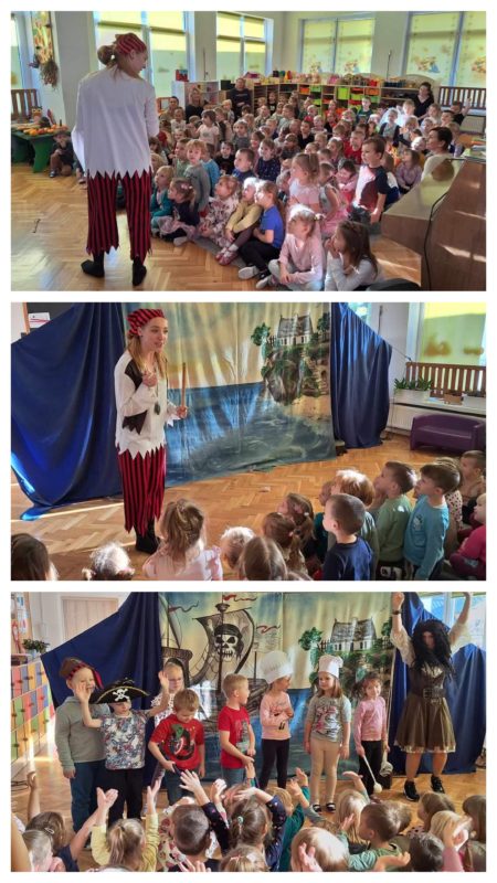 Dziś w naszym przedszkolu odbyło się przedstawienie teatralne pt. „Piraci i skarb pustyni” w wykonaniu aktorów Studio Teatralne Krak-Art. Dzieci poznały historię Kostki, która trafia na statek piracki dowodzony przez słynnego Kapitana Jacka. Wspólnie wyruszyli w podróż do Egiptu, by odnaleźć wielki skarb zwany Diamentem Nilu. Bohaterowie podczas podróży przeżyli wiele przygód, a przedszkolaki nauczyły się, że największym skarbem dla człowieka jest miłość i przyjaźń.