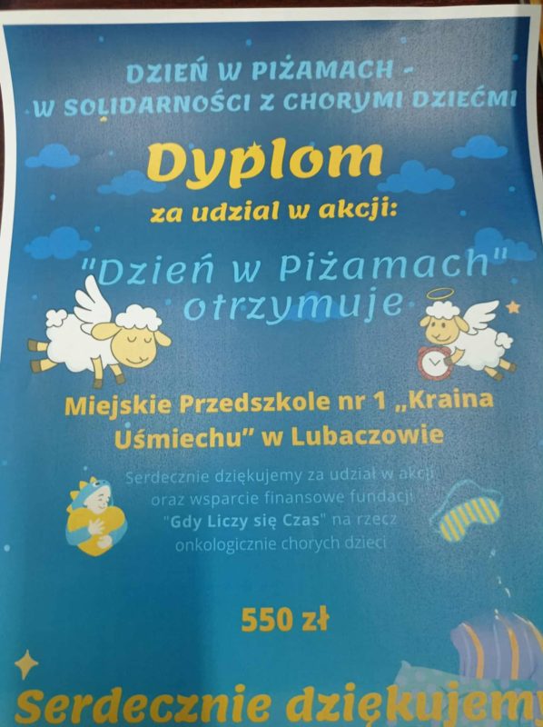 Nasze przedszkole otrzymało dyplom za udział w akcji „Dzień w Piżamach – w solidarności z chorymi dziećmi”.