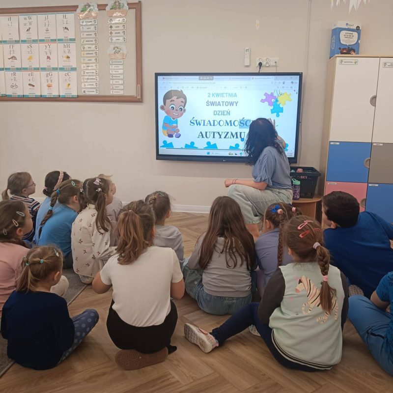 Rozmawialiśmy o tym, że każdy z nas jest inny – i właśnie to czyni nas wyjątkowymi. Poznaliśmy także różne symbole autyzmu – puzzle, motyle, znak nieskończoności oraz tęczę 🌈. Zwróciliśmy uwagę na to, że każda osoba w spektrum może utożsamiać się z innym symbolem – takim, który jest jej najbliższy.