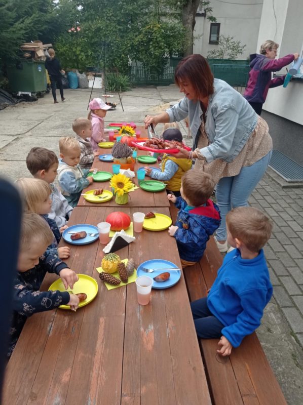 Nasze najmłodsze Smyki spędziły ten dzień w ogrodzie przedszkolnym. Oprócz gier i zabaw ruchowych również delektowały się pieczonymi ziemniakami i kiełbaskami, które wszystkim bardzo smakowały.