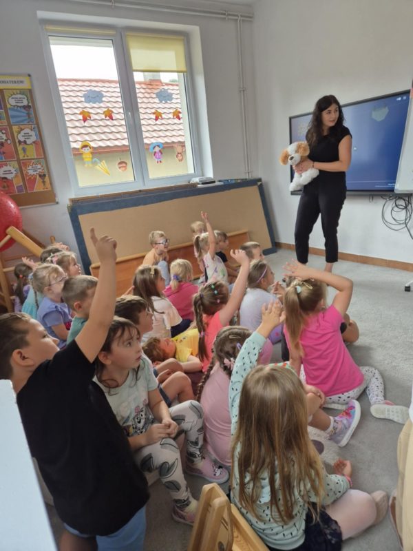Przedszkolaki uczestniczyły także w zajęciach profilaktycznych „Gadki z psem”, podczas których w przystępny i ciekawy sposób poznawały zasady dbania o własne granice i bezpieczeństwo.