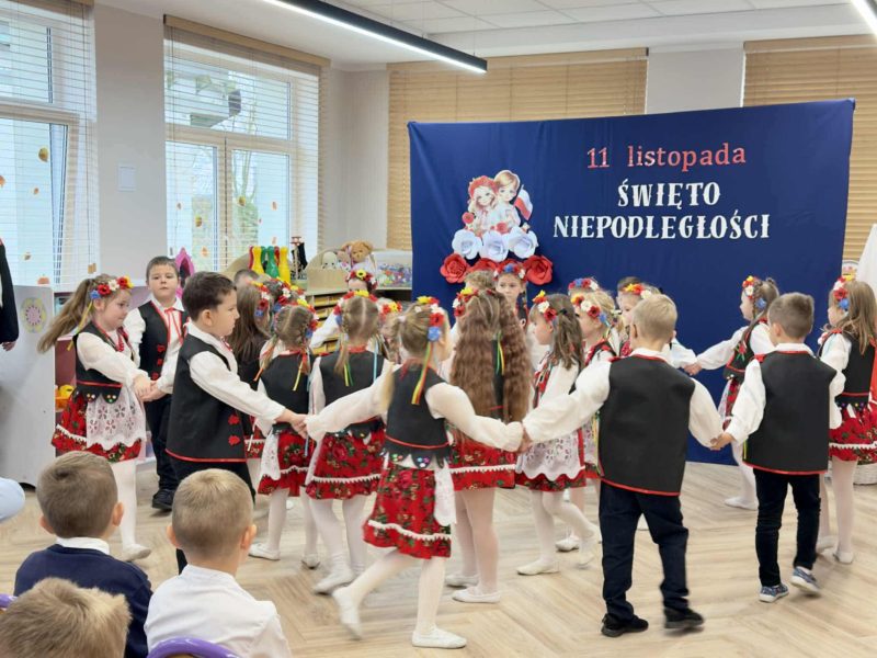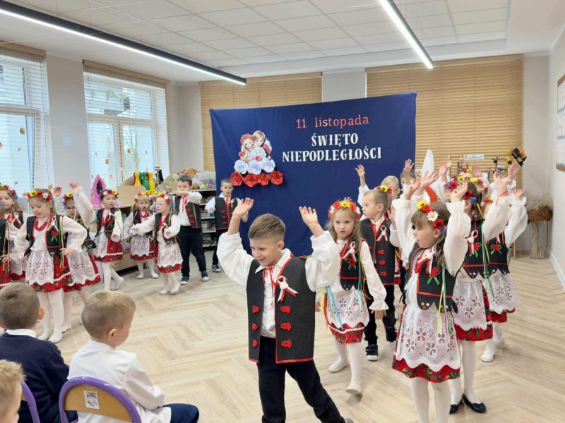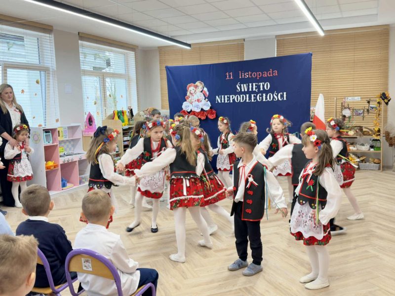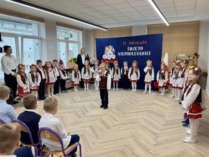 Dzieci z gr . IV ,,Łowcy Przygód ” zaprezentowały piękny program artystyczny – wiersze, piosenki i tańce o tematyce patriotycznej. Mali artyści z zaangażowaniem i radością oddali hołd naszej Ojczyźnie. Dziękujemy wszystkim za obecność, ciepłe słowa i wspólne świętowanie tego wyjątkowego dnia.