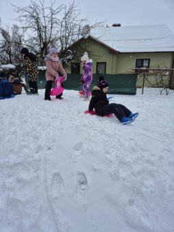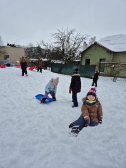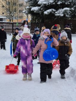Grupa V Chochliki skorzystała z pięknej, zimowej aury i wybrała się na podwórko na sanki.